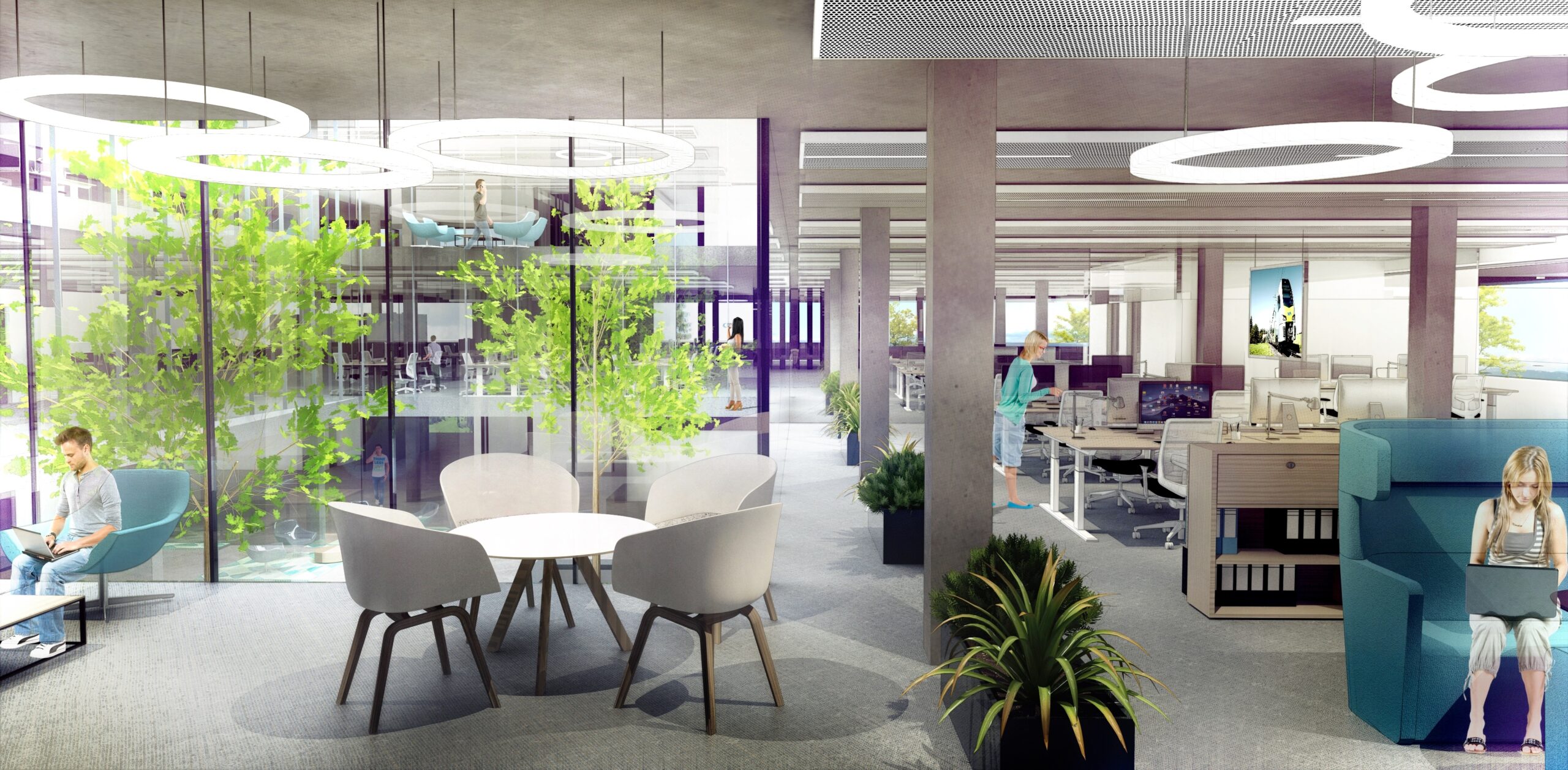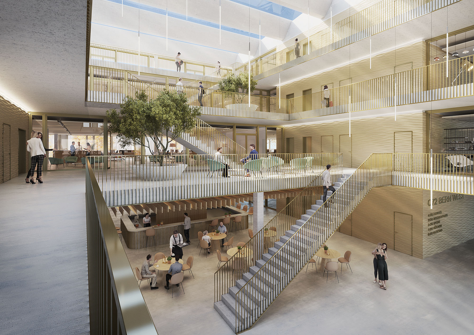Die Gebäude bieten Dienstleistungen und Büronutzung sowie grossflächige Verkaufs- und Ausstellungsräume. Moderne, flexible und zeitgemäss gestaltete Büroräumlichkeiten werden den jeweils unterschiedlichen Bedürfnissen entsprechend gestaltet. Es entstehen unter anderem vielfältige Arbeitsplätze, gemeinschaftliche Aufenthaltsbereiche und ruhige Rückzugsorte. Grosszügige Atrien schaffen Transparenz, Sichtbezüge und damit auch qualitativ hochwertige Räume.