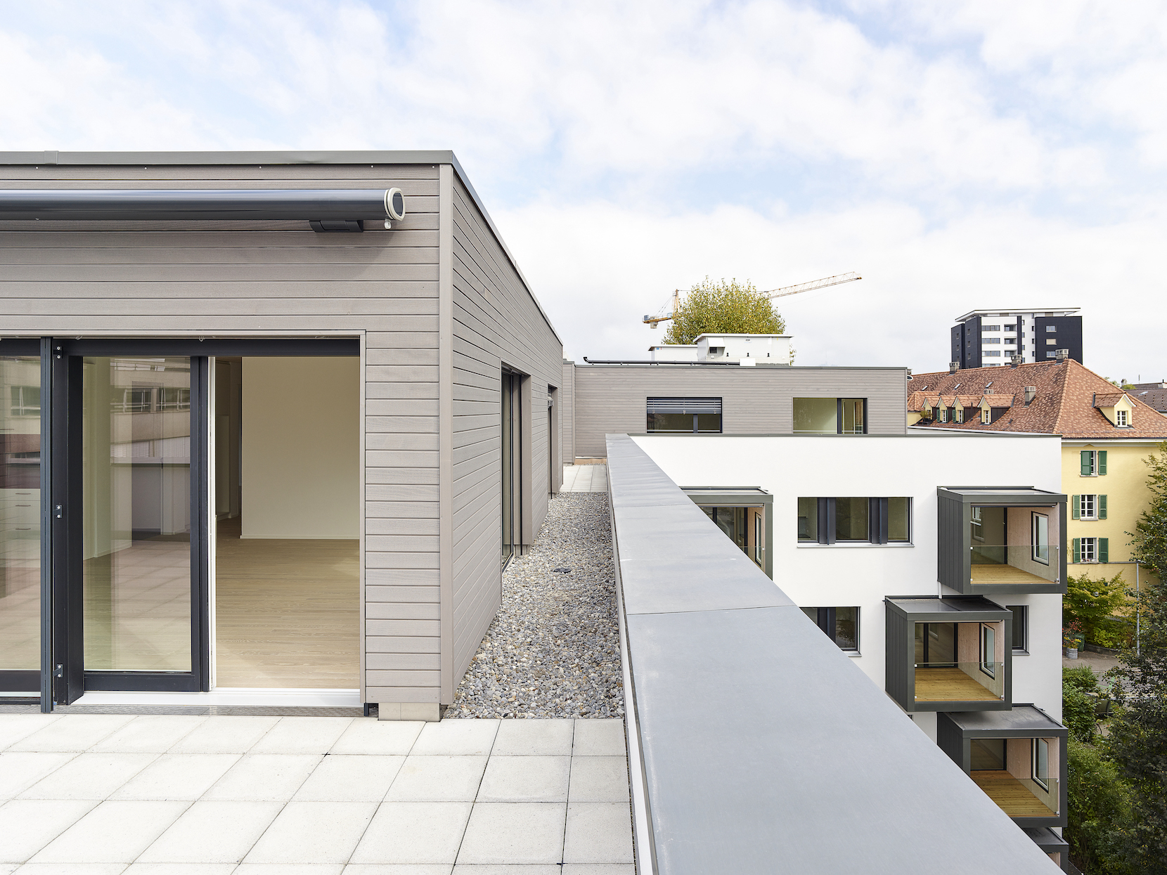 Neu finden sich vom Microappartement bis zur 4.5 Zimmer Wohnung unterschiedliche Wohnformen in verschiedenen Ausprägungen. Das Schrägdach weicht 3 Attikawohnungen und einer grosszügigen Gemeinschaftsterrasse.